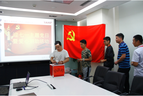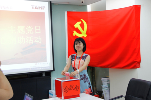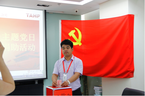 此次主题党日活动有重温入党誓词、现场爱心捐助两项内容。参加活动的全体党员又在党旗下,重温了入党誓词,铿锵有力的誓词,强烈震撼着在场的每一位党员的心灵。随后,全体党员带头进行了1对1捐资助学爱心捐款活动,各部门员工也踊跃参加,场面非常有序和谐。下一步公司不仅自身要捐款,而且还要发动分支机构进行捐款,力争8月份完成捐款活动,为更多的贫困学生家庭提供义务教育学费,为回馈社会做出我们企业应有的贡献。