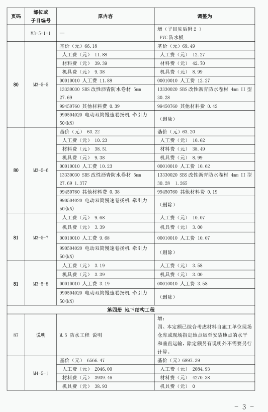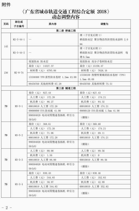 《建筑与市政工程防水通用规范》GB55030-2022(以下简称为“防水通用规范”)已颁布实施,根据新旧防水规范之间的差异,我站组织专家调整了《广东省城市轨道交通工程综合定额 2018》防水项目相关内容,现印发你们。所调整内容与我省现行工程计价依据配套使用,除合同另有约定外,已经合同双方确认的工程造价成果文件不作调整。执行中遇到的问题,请通过“广东省工程造价信息化平台—建设工程定额动态管理系统”及时反映。