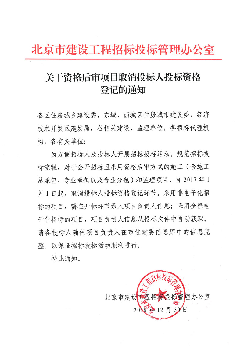 关于资格后审项目取消投标人投标资格登记的通知