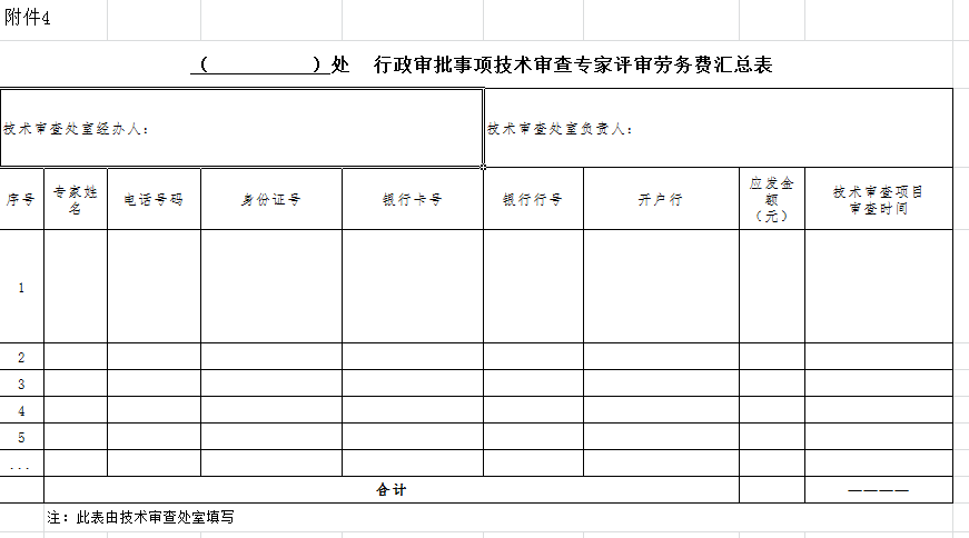 (二)评审劳务费的发放根据审批系统中评审情况,由参与评审的评审专家填写评审劳务费签字单(见附件3);经确认无误后,由相关业务处室填写评审劳务费汇总表(见附件4)报厅行政审批处;审批处计算税费后,填写评审劳务费领取汇总表(见附件5),统一报计划处逐级审批,费用由计划处直接发放至专家本人。具体标准为资质类审查标准为300元//项目类审查标准为500元//现场评审审查标准为500元//