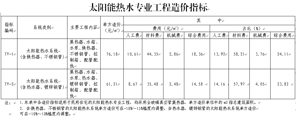 四、本指标中的太阳能集热器均采用全玻璃真空管集热器,按照总建筑面积计算造价指标。