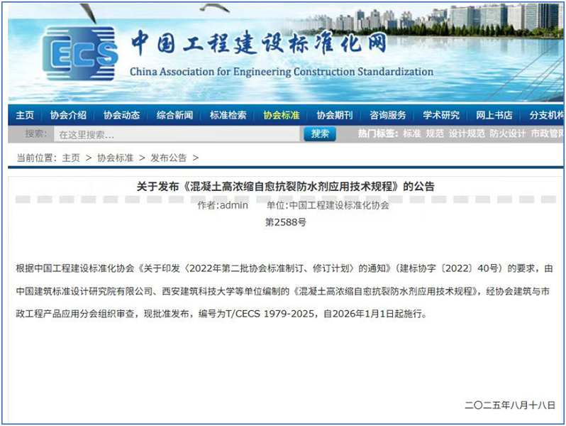 近日,经中国工程建设标准化协会批准,继我公司参编的《混凝土高浓缩自愈抗裂防水剂(T/CECS 10461-2025)》发布后,我公司参编的配套行业技术规程T/CECS 1979-2025《混凝土高浓缩自愈抗裂防水剂应用技术规程》也正式发布,并将于 202611日起实施。本规程对高浓缩自愈抗裂防水剂的材料、设计、施工、质量验收等进行了系统性规范。